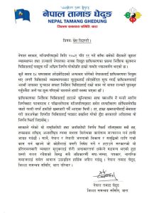 यता नेपाल तमाङ घेदुङ, जिल्ला समन्वय समिति, बारा एवं निजगढ नगरपालिका वडा नम्बर १३का वडा अध्यक्ष सुर्य घलानले सरकाले गरेको यो राष्ट्रविरोधी तथा जनविरोधी निर्णय फिर्ता नलिएसम्म सबै तह, तप्काबाट राष्ट्रिय, अन्तर्राष्ट्रिय रुपमा सशक्त विरोधका कार्यक्रम सञ्चालन गर्न साथै, नेपाल र नेपाली जनताको विकास र समृद्धिको लागि राम्रो काम गर्न खोज्ने जो कोहीलाई यसरी निषेध गर्ने र हटाउने सरकारको यो प्रतिगमनकारी व्यवहार मुलुकलाई फेरी अन्धकारतर्फ धकेल्ने षडयन्त्र भएको हुदा यस्तो गलत रवैयाको विरुद्ध सबै अधिकारर्मी संघ/संस्था, पत्रकार, नागरिक समाजलाई समेत आवाज उठाइदिन अपिल गरेका छन् ।